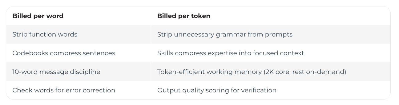 One caveat: brevity works when context is established. “fix auth” is ambiguous in isolation. With a CLAUDE.md providing project context, it’s perfectly clear. The telegrams worked because sender and receiver shared context. Same principle.