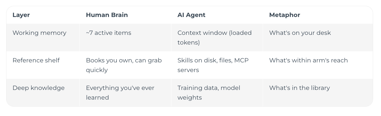 Deep knowledge is always there. Claude’s training data handles the rest, the same way your long-term memory fills in “what is a for-loop” without you consciously loading it.